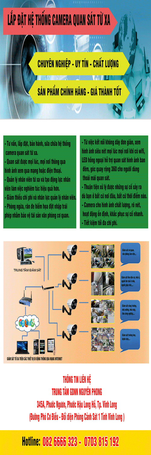 Chúng tôi chuyên cung cấp dịch vụ lắp đặt camera quan sát một cách đầy đủ và nhanh gọn với cách làm việc chuyên nghiệp, phù hợp với: Cơ Quan, Công Xưởng, Kho Bãi, Chung Cư, Nhà Trẻ, Gia Đình, Trường Học, Văn Phòng,…